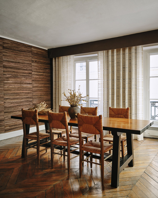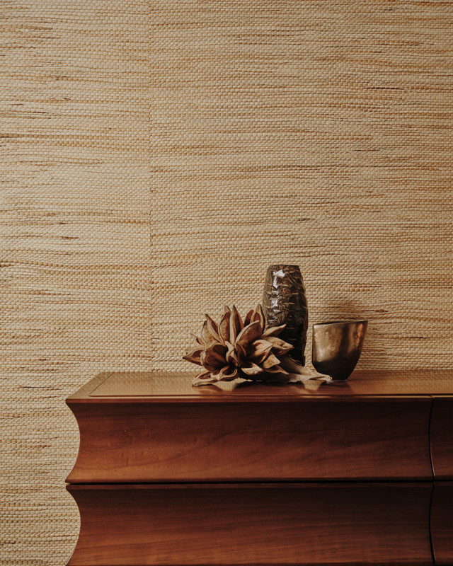 Sweeping curtains and walls clad in handcrafted natural wallcoverings created an immersive environment, revealing a collection that feels both worldly and distinctly contemporary.